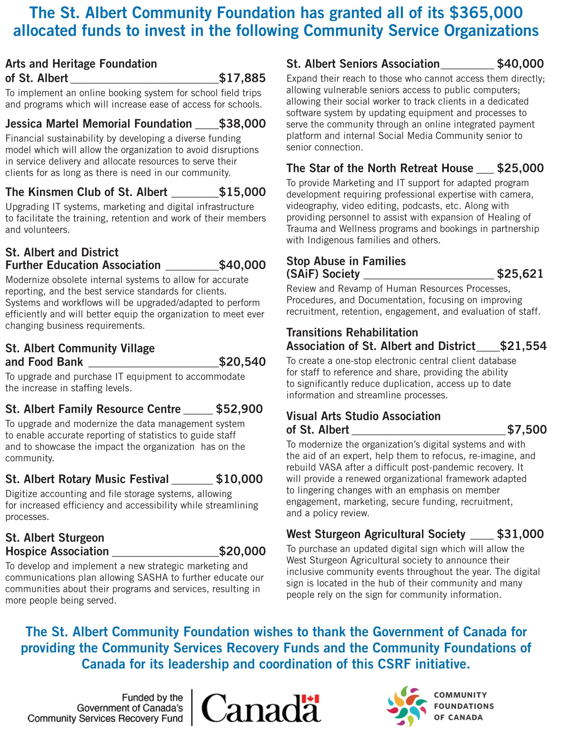 The St. Albert Community Foundation was proud to be able to grant all of its $365,000 allocated funds to invest in Community Service Organizations in St. Albert and Sturgeon County.